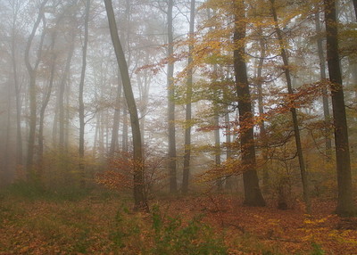 Осеннее утро в туманном лесу.