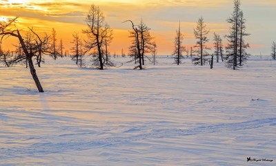 Рассвет в тундре Природа уникальная в своем многообразии. Вроде бы - каждый день встает и закатывается солнце, одни и те же деревья растут. Снег идет вроде бы один и тот же - из обычной воды. Но ведь как сложатся все эти вроде бы обычные вещи в одну композицию - так и диву даешься. |