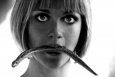 модель красивая, а типа-змея во рту как прикол