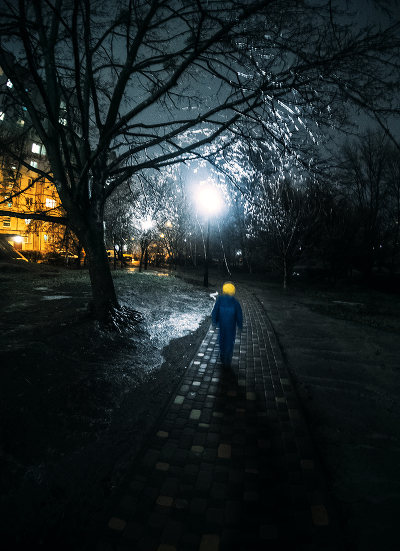 Синий вечер, яркие окна и лампы, синий человек с лампой вместо головы. Много ли надо для хорошей переклички