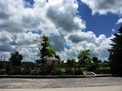 Дом, деревья,небо,облака