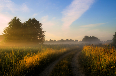 По полю.