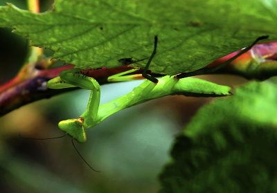 Богомол на веточке малины