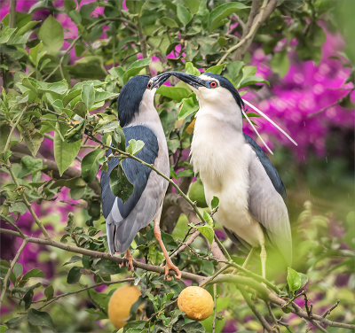 Обыкновенные кваквы на лимонном дереве обвитым бугенвилией