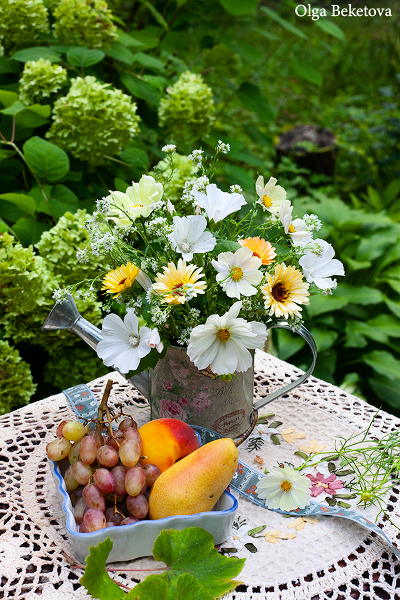 на столике в саду букет с космеями и фрукты