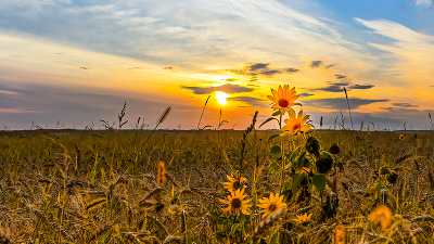 закат в подсолнухах на пшеничном поле