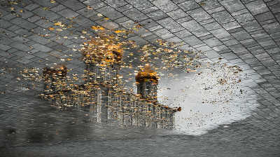 На мой взгляд, брусчатка не к месту. Я бы оставил только отражение и листья.
