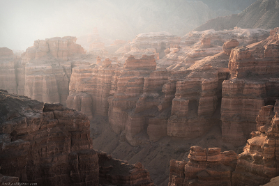 "Чарынский каньон" Долина замков - это левый, боковой каньон, расположенный в средней части главного Чарынского каньона. Он протянулся на 2,5 километра от места слияния. Мне повезло, я увидел здесь настоящие замки! К моему приезду в каньоне была сильная дымка. После восхода солнца туман начал светиться, отделив причудливые формы выветривания от заднего плана. Алматинская область, Казахстан |