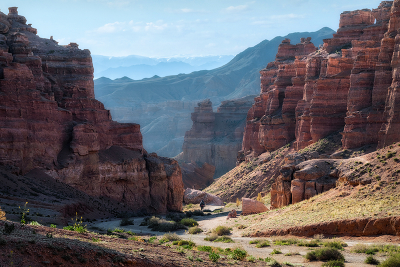Утро в каньоне Юго-восточный Казахстан. Северный Тянь-Шань. Всё утро мы провели наверху Чарынского каньона, любуясь восходом Солнца, и только потом спустилась на его дно. Нам сильно повезло,-там шли съёмки какого-то фильма и каньон был практически свободным от людей и машин. |
