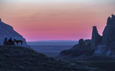 Синий час после заката в Долине замков, Казахстан, полуостров Мангистау.