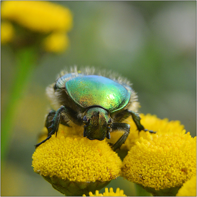 Решимость. Бронзовка золотистая - Cetonia aurata. 1,2 - 2 см в длину. Питается нежными частями цветка (пыльцой). В отличии от других жуков в полете надкрылья остаются сложенным (крылья расправляются через боковые вырезки надкрылий). |