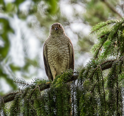 Красавица - мать пяти птенцов. Ястреб перепелятник самка. Могу с уверенностью сказать, самая серьёзная защитница своего потомства. (из тех, что я видела в предыдущие года) Удивлена была яростью битвы, когда она разгоняла ворон, что кружили над деревом, да и на меня пикировала пару раз ! )) И уверена, что на других прохожих тоже. |