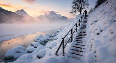 Величественный пейзаж с заснеженными горами и озером, окутанным утренним туманом.