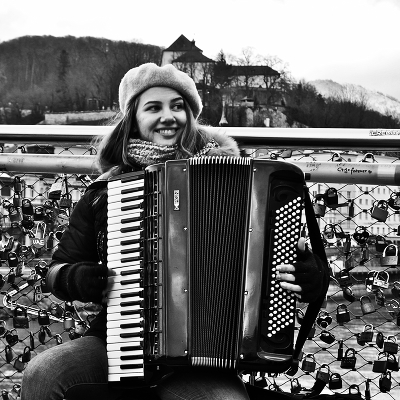 От улыбчивой девушки, на пешеходном мосту над рекой Salzach в Зальцбурге.