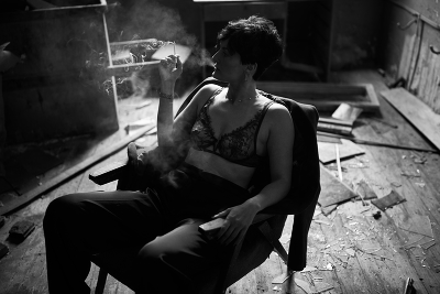 Белую часть полочки или подоконника над головой я бы убрал - выбивается. Может кадр капельку вправо наклонить - ничего бы важного в сюжете не потерялось. Обстановка выразительная и сигаретный дымок живенько получился.