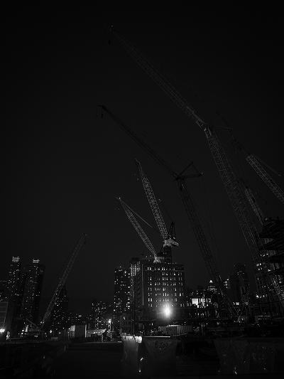 Здорово! Если бы ещё на небе, млечный путь или просто звезды, был бы шедевр. А так глаза по стрелам кранов бегут наверх, а там пустота.