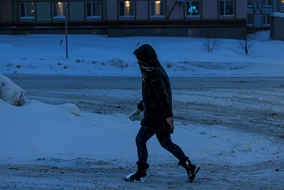 Девушка идет в магазин сквозь метель