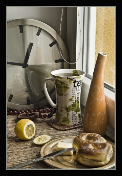 , возможен и другой подход- предпочёл бычуть ниже камеру и резкость собственно на полдник,тогда часы покажутся излишними и громоздкими