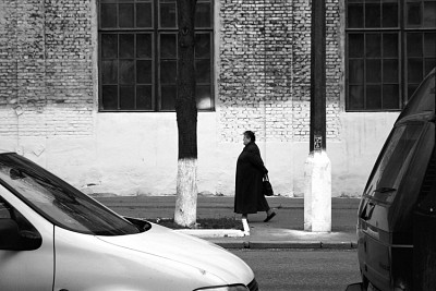 , Если так кадрировать, то потеряется деталь, которая мне нужна. Эта пилястра на кирпичной стене. Посмотрите, везде есть парность: пилястры, дерево и столб, окна, машины. Статичные вещи парны, а женщина одна.