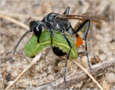 Аммофила #4 Оса отыскала добычу – небольшую гусеницу. У гусениц нервная система примитивна и рассредоточена по сегментам тела. Тут одним уколом не обойтись, приходится колоть последовательно в каждый сегмент, пока наконец гусеница не будет парализована полностью. Процедура эта занимает некоторое время, так что я успел изготовиться и сделать пару кадров. |