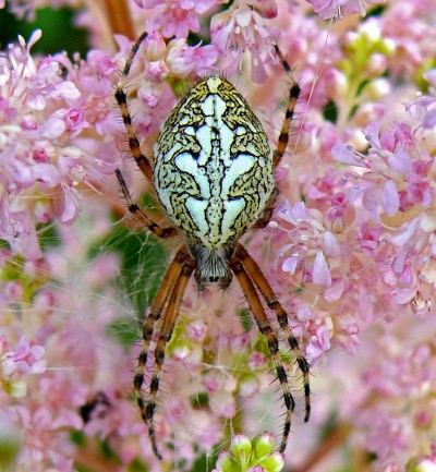 достаточно большой паук, днем прячется, на охоту выходит вечером, паутина большая круговая.