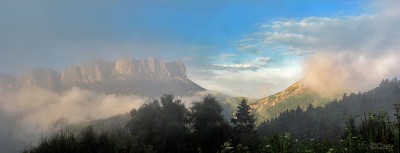 Закатная сказка Весь день с переменным успехом лил проливной дождь, поэтому с лагеря не снялись, и остались на поляне Шестакова. Туман ограничивал видимость до 20-50м. Но на закате дождь перестал, пелена внезапно раздвинулась, и природа подарила незабываемое зрелище... Участок Передового хребта, г.Большой и Малый Тхач, Краснодарский край |
