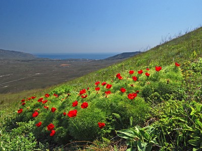 Крым, море, горы, пионы, пейзаж, дорога