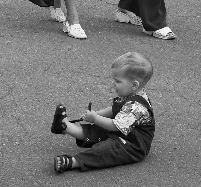 А мне нравится, что ноги взрослых в кадр попали, иначе малыш был бы одинок в кадре. И присутствие других показывает, насколько он поглощён своим делом!