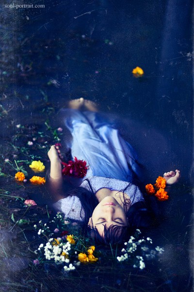 возможно, стоило бы в диагональ девушку уложить... а вот обработка, по-моему замечательно образ подчеркивает...