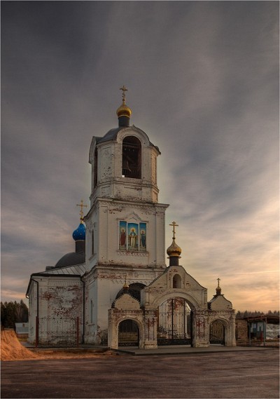 он реставрируется на данный момент да же табличку сняли название храма и боюсь долго будет востановление так как от Москвы находится порядка 100 киллометров