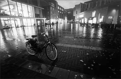 Город после дождя.Листья.Одинокий велосипед.