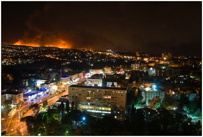 Пожар Горит лес на Кармэли Огромный лесной пожар бушует в окрестностях Хайфы, фронт огня достигает 10 км,(весь Кармэль-28 км) несколько населённых пунктов эвакуировано, Премьер министр Израиля Нетаньяху обратился за помощью к Греции, Кипру, Италии и России, ожидается с утра прибытие 10 пожарных самолётов с этих стран http://haifa.israelinfo.ru/news/6850 подробности тут а так ночью выглядел пожар из центра города: |