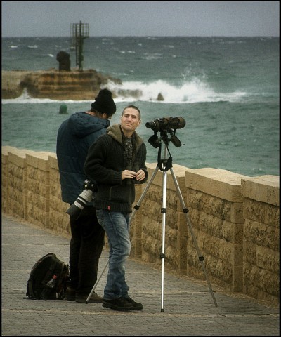 у штормящего моря Израиль. Набережная Тель-Авив-Яффо. Двое, вооружившись разными оптическими приборами, что-то пристально высматривали в морской дали, невзирая на штормовую погоду и надвигающуюся грозу. |