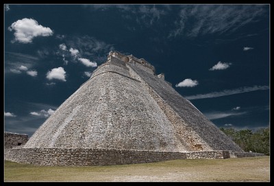 пирамида волшебника Ушмаль (Uxmal) — руины некогда крупного города майя на северо-западе полуострова Юкатан, на территории современного мексиканского штата Юкатан. Название Ушмаль происходит от «ox-mal», что на языке майя означает «три раза». Город основан 15 августа 1007, основатель Ах Суйток Тутуль Шив. |