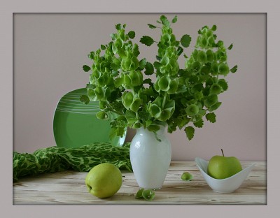 Букет в натюрморте из цветов молюцеллы,интересно английское название молюцеллы - ирландские колокольчики.В Сирии и Израиле ее называют молуккской мелиссой.