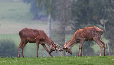 Гон оленей. Гон начинается осенью В период гона возможны драки между самцами, благодаря которым животные устанавливают первенство. Соперники сталкиваются рогами, пытаясь сбить с ног друг друга. Более слабые самцы быстро покидают поле боя. Узнать, сильный самец или слабый, можно не только по внешнему виду, но даже по голосу. У сильного и более опытного оленя голос хриплый и низкий, а у молодого и слабого — более высокий и чистый. Поединки крайне редко заканчиваются трагически, хотя бывали случаи, когда самцы ломали рога, или так переплетались ими, что не могли самостоятельно расцепиться и просто умирали от голода. |