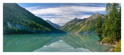 Алтай, Аккемское озеро. Берега усеяны десятками палаток туристов. Утром дым от костров стелется по озеру, создавая иллюзию тумана