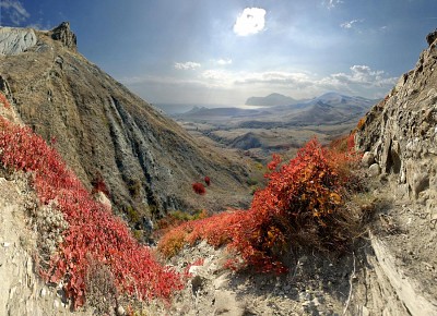Хорошее зовущее ощущение полета - Главный герой выделен цветом - кусты - они формируют направленность движения взгляда (от крупного на ПП до среднего и дальше к маленькому) - а горы небо и простор завершают свое дело (ИХМО свет снимка можно приглушить - чтобы не перетягивал внимание - закон что ярче светлее то и основное - а здесь основное не камни на ПП и не небо - в любом пейзаже главное простор воздух)