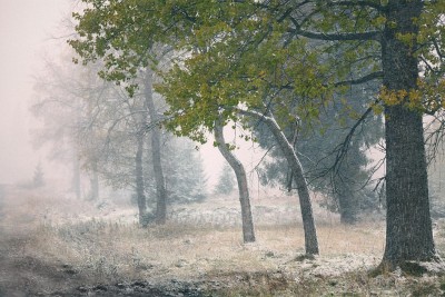 Тополь - ближе, елки дальше - конечно их будет хуже за метелью видно...