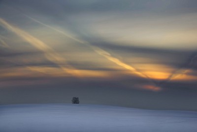 По моему, образовалось 2 композиционных центра внимания - дерево и точка, куда сходятся линии на небе. Это разбалансирует композицию.