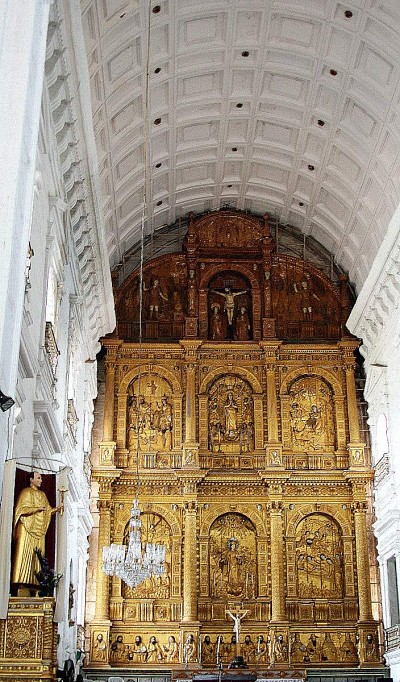 Позолоченный алтарь. Проход длиной 80 метров заканчивается резным позолоченным алтарем, одним из самых красивых в Индии. В соборе есть купель индусского происхождения. Кафедральный собор святой Екатерины славен своими колоколами. Один из них, «Золотой колокол», входит в число лучших в мире. |