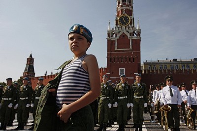 Мальчик стоит на Красной площади в день празднования дня воздушно -дисантных войск. Москва 2 августа.