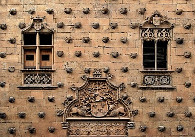 Гербы с ракушками. все взгляды приковывает, пожалуй, самое узнаваемое здание Саламанки – Дом с ракушками. Построен этот дворец был в 1493-1503 гг. в честь бракосочетания благородного дона Родриго Ариаса Мальдонадо (Rodrigo Arias Maldonado) и не менее благородной доньи Марии де Пиментэль (María de Pimentel). Щедро разбросанные по фасаду ракушки и лилии – символы обеих семей (раковины были символом Ордена Сантьяго, к которому принадлежал новобрачный). В 1701 г. дворец расширили, появился фасад, смотрящий на улицу Майор, и туда тоже добавили раковины. Кроме ракушек, по всей поверхности двух фасадов (один смотрит на центральную улицу, другой - в переулок) имеются гербы обоих вельможных родов. |