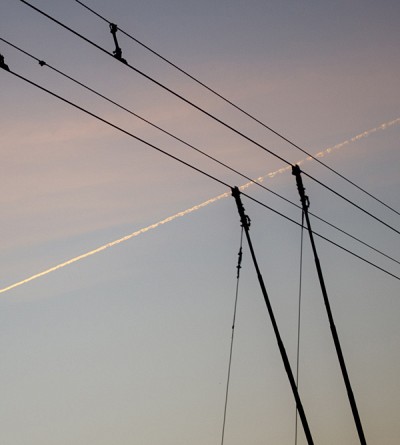 Каковы же атрибуты метафизики? Вот они, примерно и косноязычно: в кадре есть тайная жизнь предметов (как след самолета на примере выше - вроде и всегда тут был, в мире металлических линий, а вроде и в гости заглянул, случайно), у предметов есть двойной - тройной и так далее,смысл. Электрический Провод - он не просто провод (кстати, мы не знаем какой именно), он - овеществленная идея, на которую штанги троллейбуса только намекают, только задают ее контур.