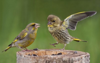 Птенец зеленушки обыкновенной (справа) уже больше папы, а продолжает настойчиво требовать у него еду...