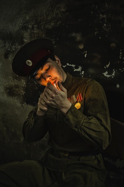 да много тут непонятных моментов. Воротник-стойка, предположим, был введен в январе 1943 ( http://opoccuu.com/rkka02022.jpg ). До этого был отложной. ( http://www.opoccuu.com/rkka1.jpg ). То есть "датировка" вашего воина по гимнастерке - не ранее января 1943 года. Однако, ровно в те же сроки были введены погоны. А вы их бойцу не нацепили. Далее, ремень - солдатского образца, но кокарда - офицерская, которая была введена в 1970 году.. Ремень, соотвествующий вашей дате был бы, скорее всего, брезентовым ( http://www.feldwebel.ru/UserFiles/Image/img79_23943.jpg ) и с прорезной пряжкой. Брезентовый/кожаный ремень со сплошной пряжкой появился, насколько я помню, после войны. Так что ваш воин с набором анахронизмов - просто подарок для первого встречного патруля))