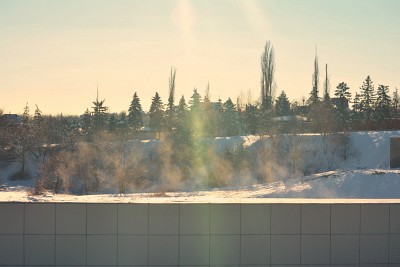 В морозный день яркое солнце ,испарения ,пар.