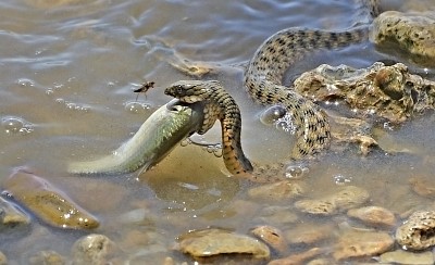 На Днестровском лимане уж охотится на рыбу. Подлетело что то.