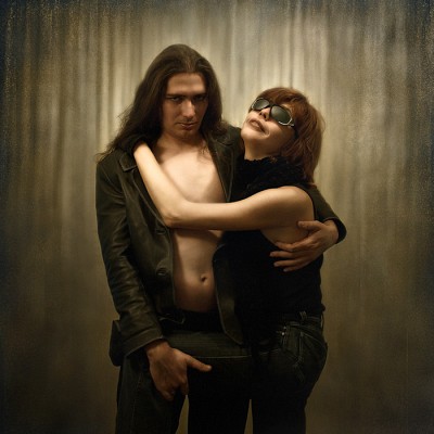 Любовь действительно слепа. Поскольку это не портрет , а постановочное фото , то парню можно было бы уделить внимание не камере, а своей "слепой партнёрше" (где то в области шеи ) . Тогда её жест был бы уместен. И коленочку рукой повыше, в правую область своей поясницы . Тогда все вопросы