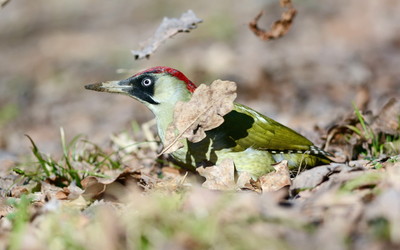 Самка зелёного дятла в поиске еды разбрасывала листья.